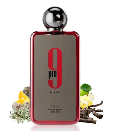 El perfume Afnan 9 PM Rebel 100ml es una fragancia aromática frutal para hombres (y a veces unisex) lanzada en 2024, que huele a una mezcla fresca y jugosa de **piña, manzana verde (Granny Smith) y mandarina, con un corazón cálido de vainilla, cedro y musgo de roble, y una base dulce y profunda de caramelo, ámbar, maderas secas y almizcle, creando un aroma adictivo, moderno y versátil para el día y la noche.
