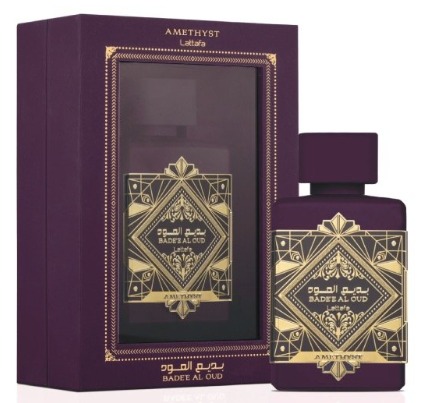 Lattafa Bade’e Al Oud Amethyst (botella violeta) es un perfume unisex de 100ml, intenso y sofisticado, ideal para la noche o climas fríos. Se caracteriza por una fuerte mezcla de rosa turca/búlgara, madera de oud y vainilla, con notas especiadas de pimienta rosa. Ofrece alta duración (6-8+ horas) y una proyección notable.