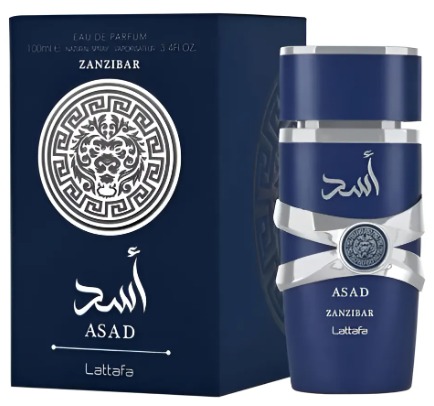 El perfume Lattafa Asad, especialmente la versión «azul» o Zanzibar, huele especiado, amaderado y dulce, con notas de coco, lavanda, pimienta, vainilla e incienso, evocando un aroma exótico y fresco, similar a una noche tropical, siendo una alternativa popular a perfumes de diseñador como Dior Sauvage Elixir, pero con un toque más tropical y gourmand en la versión Zanzibar.